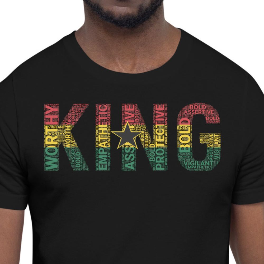 Designed specifically for Black men from Ghana. This stylish tee features a striking design that highlights the empowering word "KING," filled with uplifting terms like Worthy, Assertive, Vigilant, Empathetic, Protective, and Bold—qualities that reflect the essence of who you are. The cluster is colored with the Ghanaian flag with the black star in the center of the cluster.
