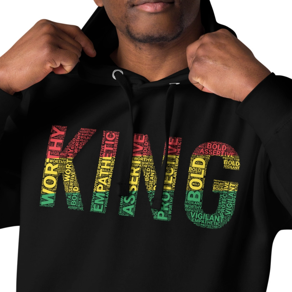 Black men should see themselves as kings because it reinforces a sense of identity, pride, and self-worth that is crucial in a world that often undermines their value. This empowering word "KING" encourages Black men to recognize their strengths, achievements, and potential, and is filled with uplifting terms like Worthy, Assertive, Vigilant, Empathetic, Protective, and Bold—qualities that reflect the essence of who you are. Embracing the idea of being a king promotes a mindset of leadership, responsibility, and resilience, empowering them to take on challenges and strive for greatness, which is beautifully represented in expressions like the Black King hoodie. This perspective fosters confidence and ambition, allowing them to create positive change in their lives and communities, particularly within the realm of Black American clothing and culture.
