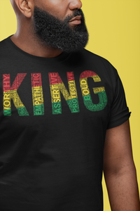 Black men should see themselves as kings because it reinforces a sense of identity, pride, and self-worth that is crucial in a world that often undermines their value. This empowering word "KING" encourages Black men to recognize their strengths, achievements, and potential, and is filled with uplifting terms like Worthy, Assertive, Vigilant, Empathetic, Protective, and Bold—qualities that reflect the essence of who you are. Embracing the idea of being a king promotes a mindset of leadership, responsibility, and resilience, empowering them to take on challenges and strive for greatness, which is beautifully represented in expressions like the Black King shirt. This perspective fosters confidence and ambition, allowing them to create positive change in their lives and communities, particularly within the realm of Black American clothing and culture.